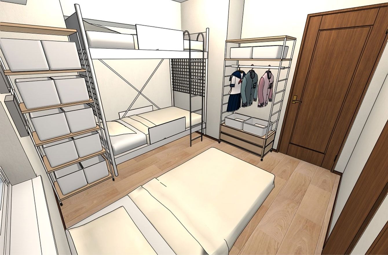 「子ども寝室」には、収納家具も置いて、掃除から衣服などの管理も兄弟姉妹でできるようにする