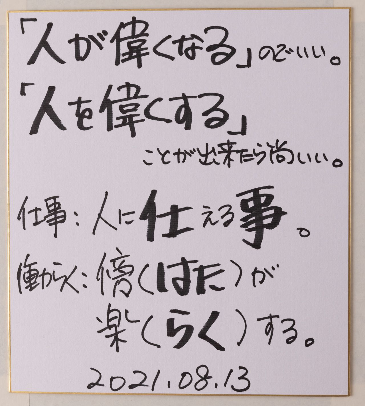 「人が偉くなる」のでいい。「人を偉くする」ことが出来たら尚いい。仕事:人に仕える事。働らく:傍(はた)が楽(らく)する。2021.08.13.