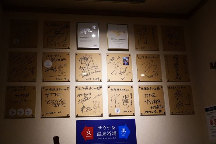 サウナの入り口にはインフルエンサーのサインが展示されている