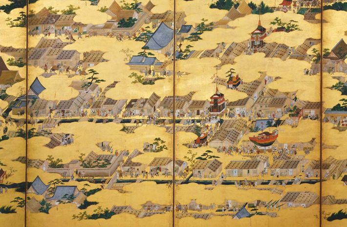 上杉本洛中洛外図(1565年、狩野永徳作、国宝)の右隻(部分)。水害で流されてもすぐに建て直せる、板張屋根の庶民の家々が描かれている。(画像=米沢市上杉博物館/ブレイズマン/CC-PD-Mark/