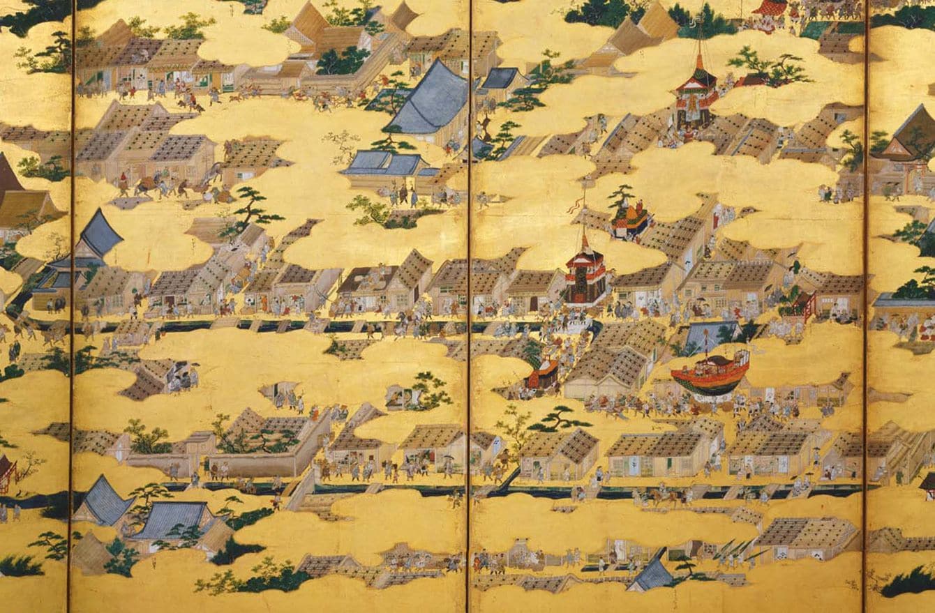 上杉本洛中洛外図(1565年、狩野永徳作、国宝)の右隻(部分)。水害で流されてもすぐに建て直せる、板張屋根の庶民の家々が描かれている。(画像=米沢市上杉博物館/ブレイズマン/CC-PD-Mark/