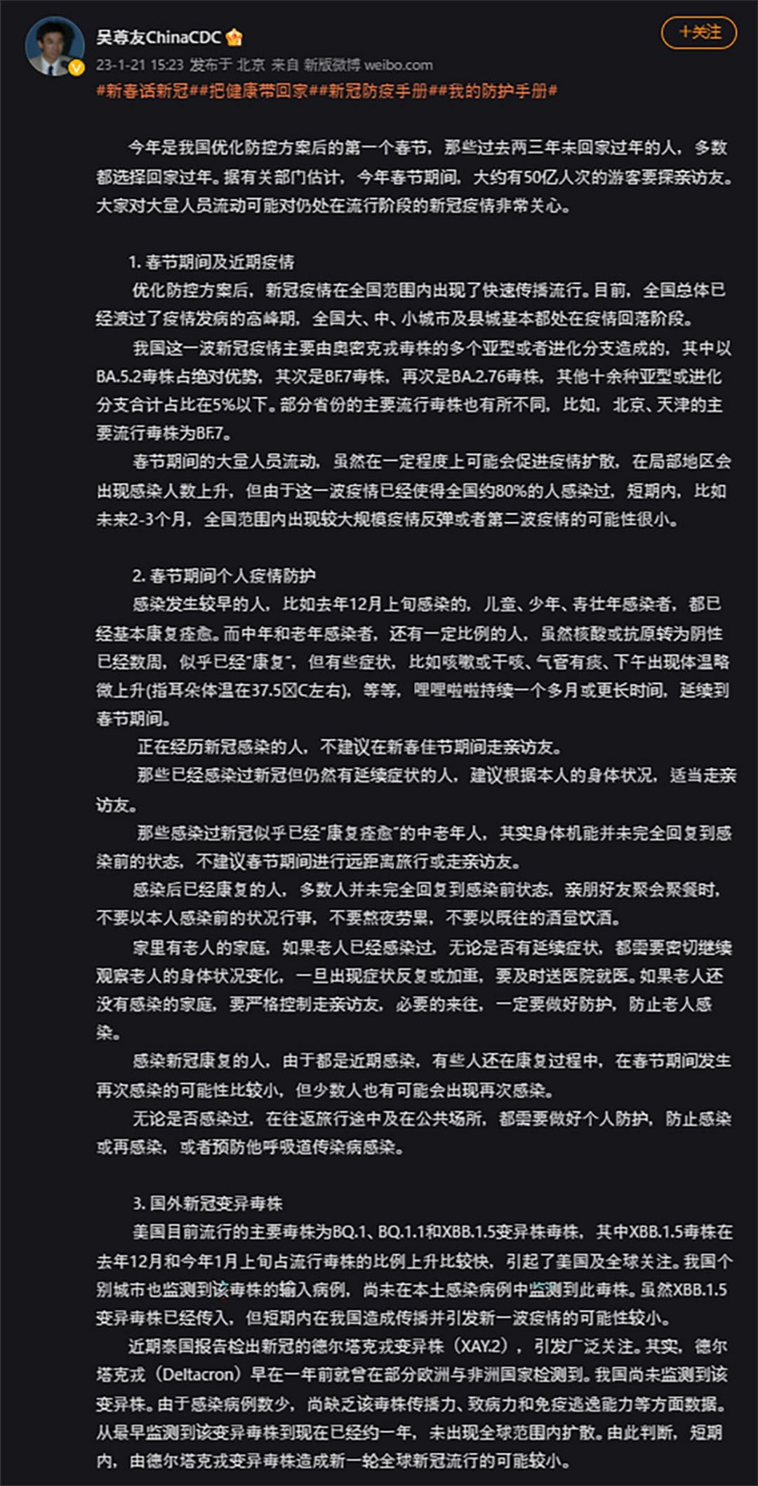 中国疾病予防管理センター(CDC)首席専門家の呉尊友氏の「微博」への投稿