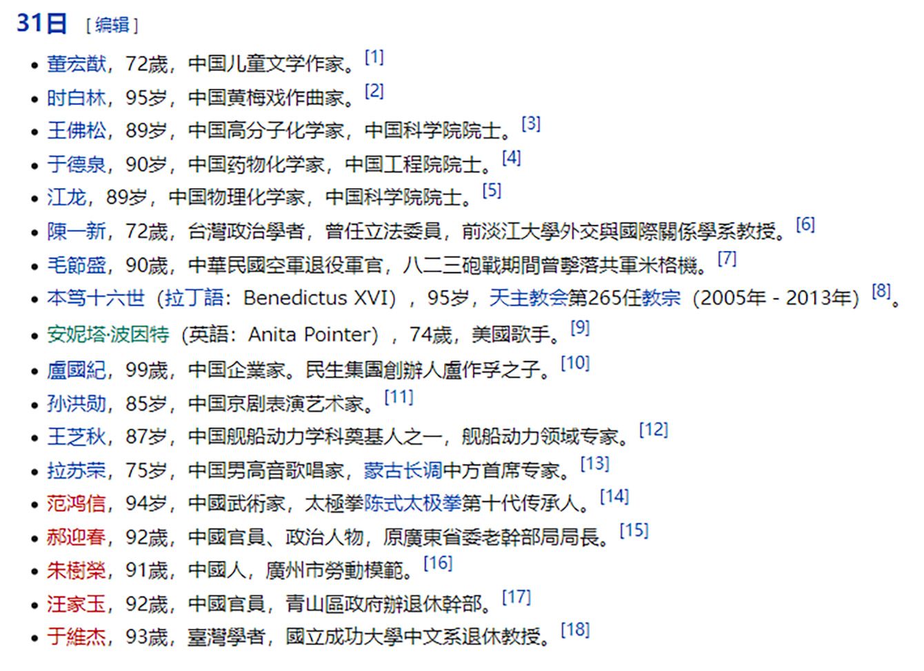 2022年12月31日に亡くなった著名人のリスト。18人が記載されていてこのち4人が外国人のため、実質的に中国人は14人