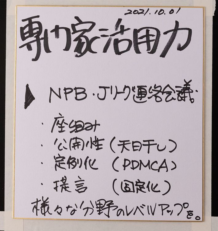 専門家活用力。NPB・Jリーグ連絡会議。座組み、公開性(天日干し)、定例化(PDMCA)、提言(固定化)。様々な分野のレベルアップを。2021.10.01.