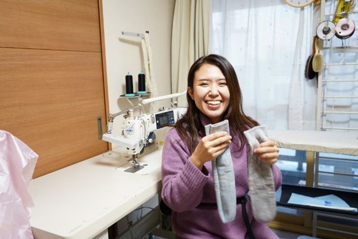 「前後、左右、表裏のない靴下」を作った田村優季さん。