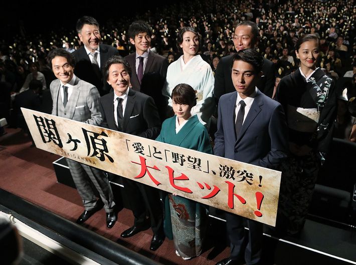 映画「関ヶ原」のロードショーが始まり、舞台あいさつする東出昌大さん(前列右端)ら出演者=2017年8月26日、東京都千代田区