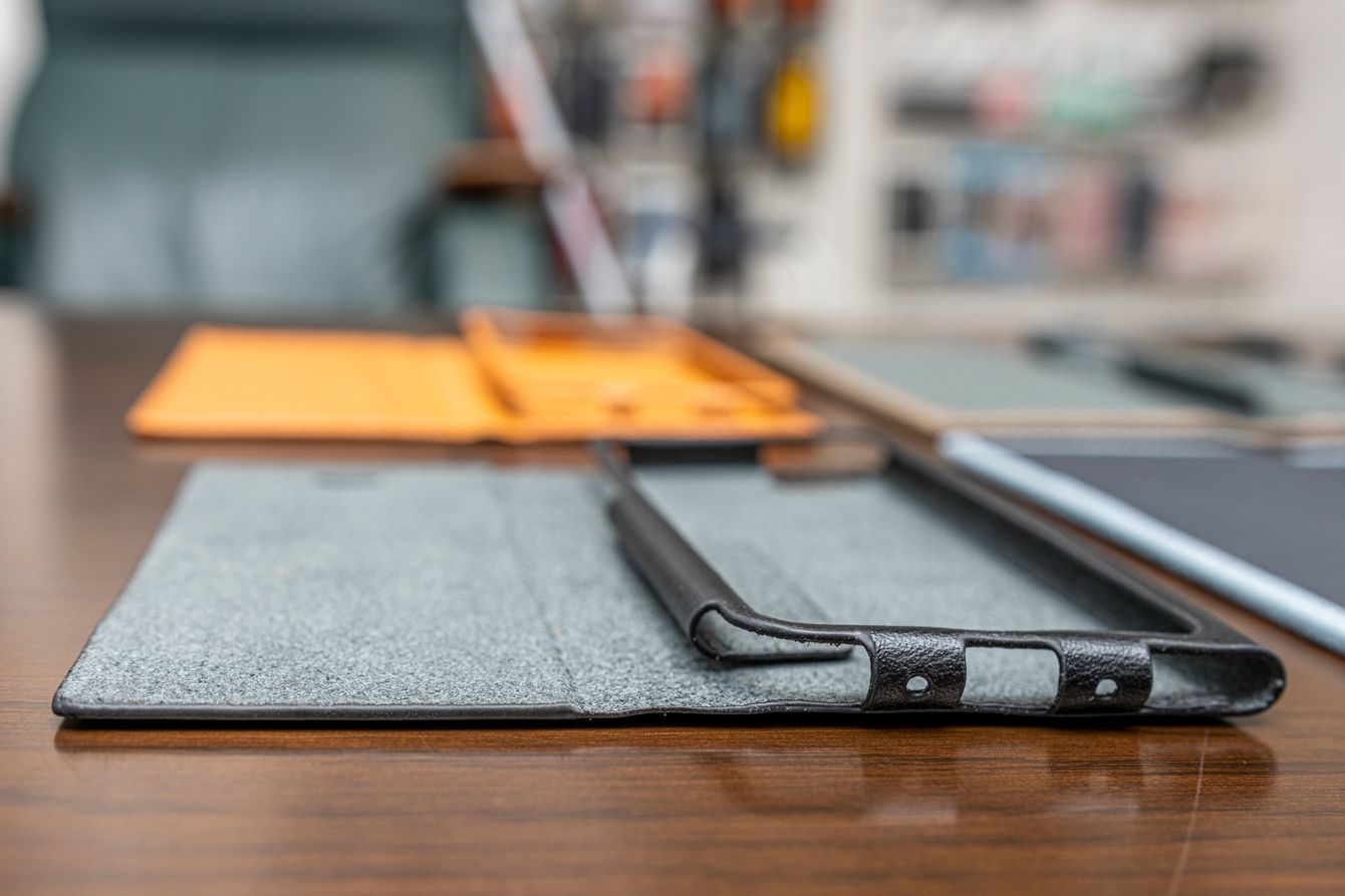 角に丸みのある一般的な手帳型ケース(奥)と異なり、GRAMASのケース(手前)は直角になっている。GRAMASのケースは、革の端を折ってからステッチを施す「ヘリ返し技法」で仕上げることにより、耐久性を高めている