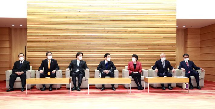 閣議に臨む岸田文雄首相(中央)ら=2023年2月10日、首相官邸