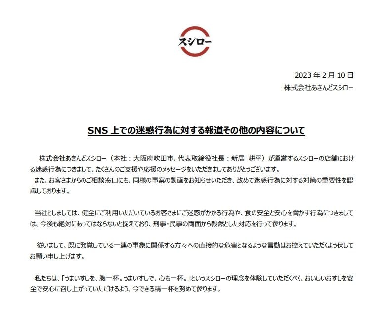 スシローの運営会社は2月10日、「既に発覚している一連の事象に関係する方々への直接的な危害となるような言動はお控えていただくよう伏してお願い申し上げます」と