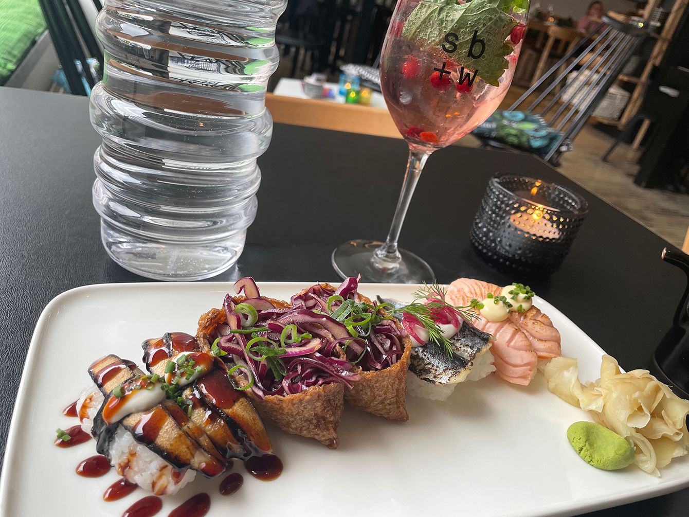 ディルやチャイブなどのハーブ使いも北欧らしく、キノコや紫キャベツなどの野菜を使ったヴィーガンお寿司のバラエティも豊富だ