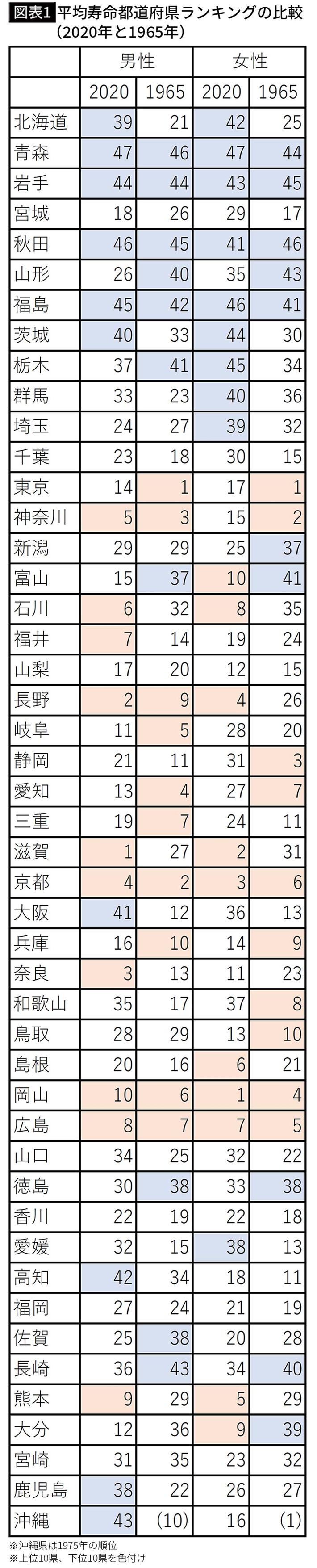 2020年と1965年の平均寿命都道府県ランキングの比較