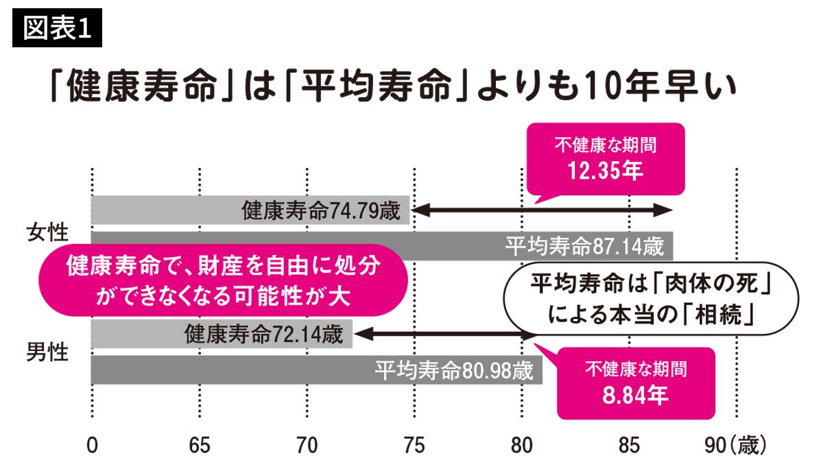 平均寿命(平成22年)は、厚生労働省「平成22年完全生命表」。健康寿命(平成22年)は、厚生労働科学研究費補助金「健康寿命における将来予測と生活習慣病対策の費用対効果に関する研究」(出所=『