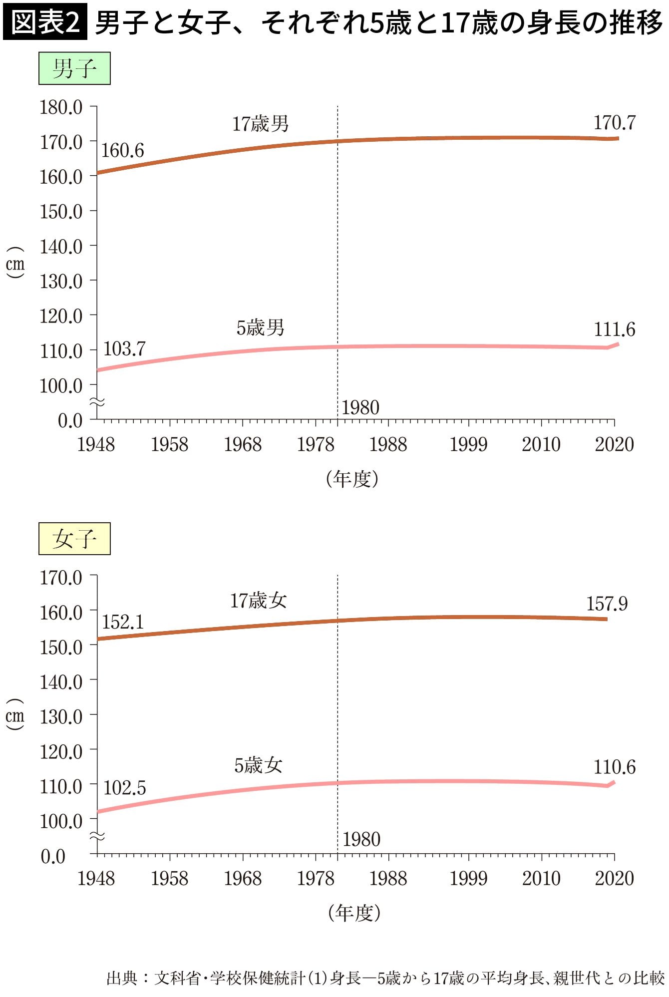 男子と女子、それぞれ5歳と17歳の身長の推移(出所=『