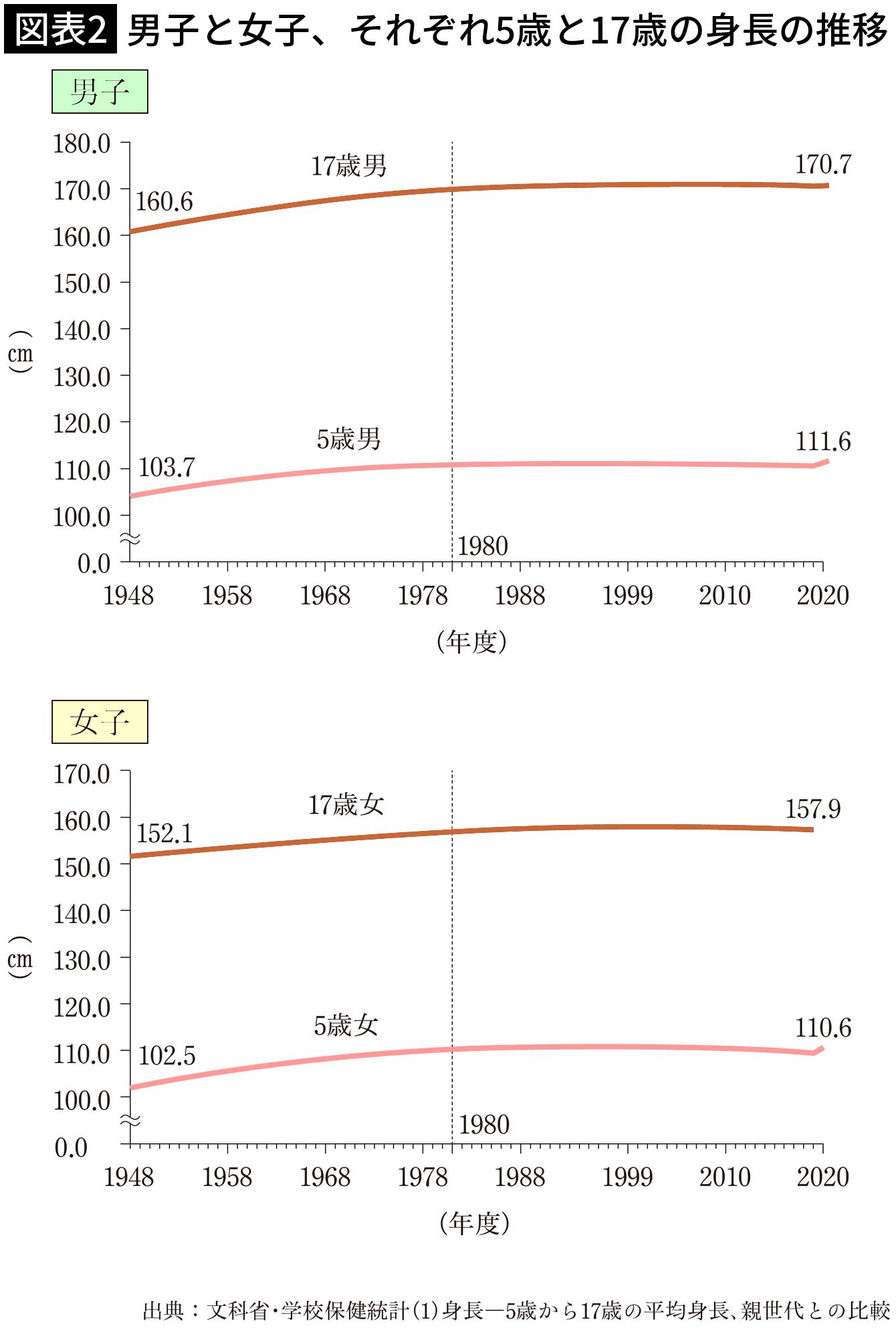 1948年度と2020年度における男女5歳と17歳の身長の比較(出所=『