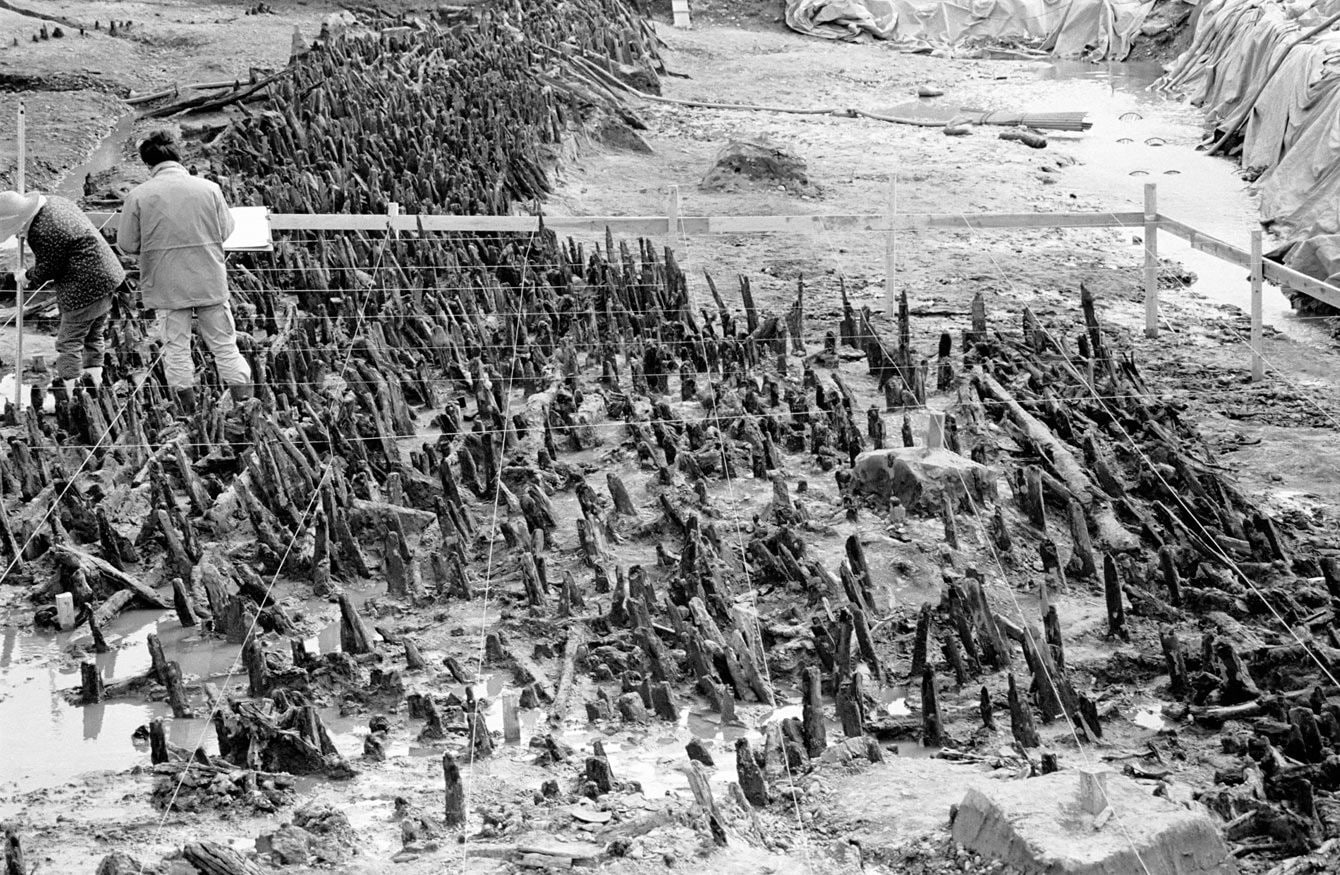 岡山市の津寺遺跡で発掘された、多数の杭が打ち込まれた遺構(1989年3月17日)