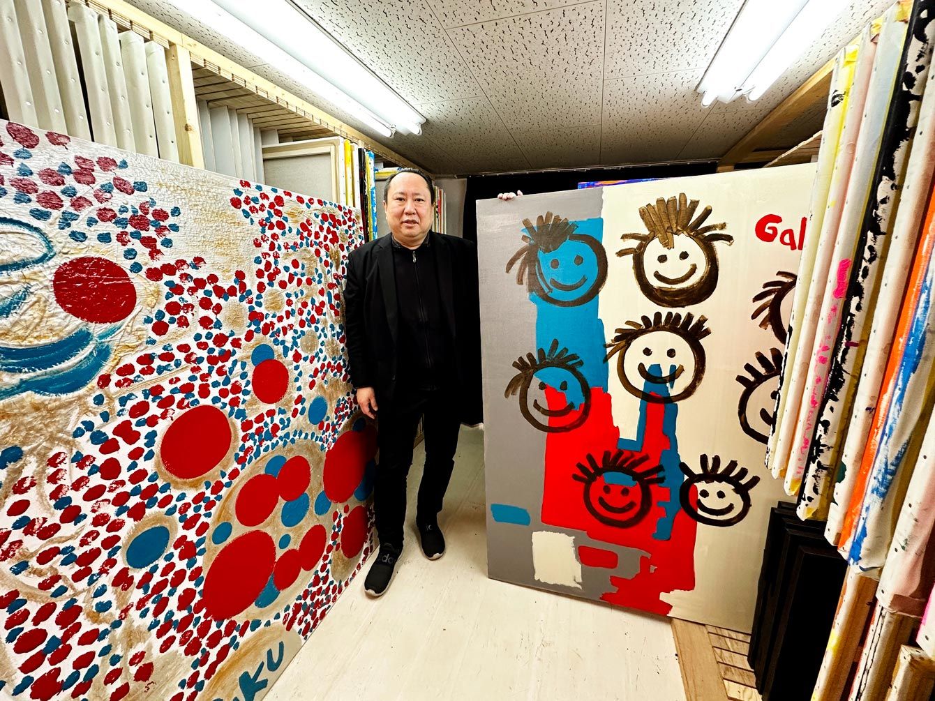 笑顔で作業するGAKUさん。今では年間200枚の絵を描くという