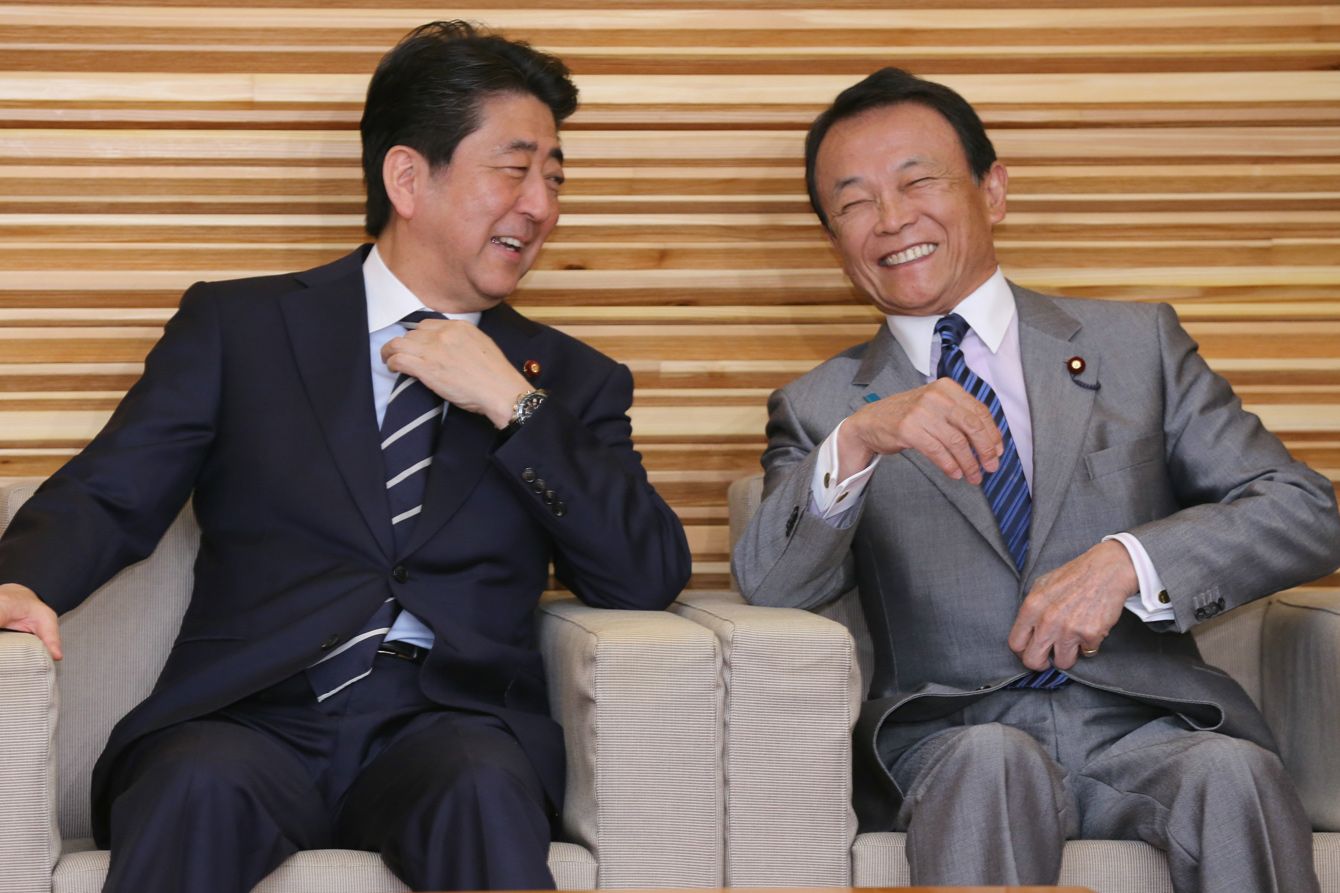 閣議に臨む安倍晋三首相(左)と麻生太郎副総理兼財務相=2018年5月15日、首相官邸