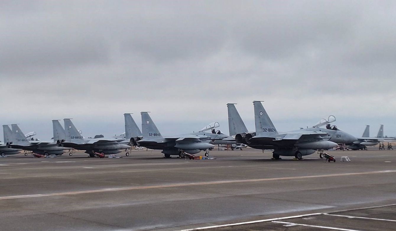 F15戦闘機が並ぶ航空自衛隊新田原基地