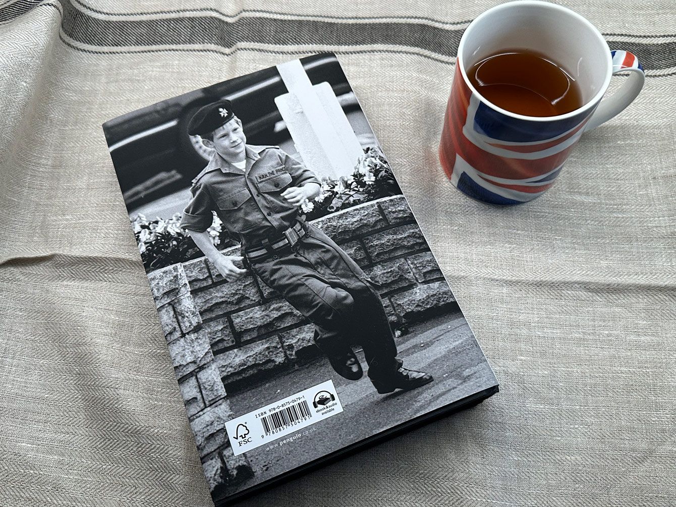 『スペア』の裏表紙には子どものころのハリー王子の写真が。ユニフォームの胸には、王室離脱で返上した「HRH(殿下)」の敬称がついている