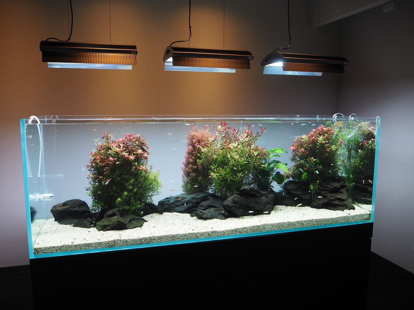 「めだかやドットコムミュージアム」の水槽では色鮮やかなめだかが泳ぐ。
