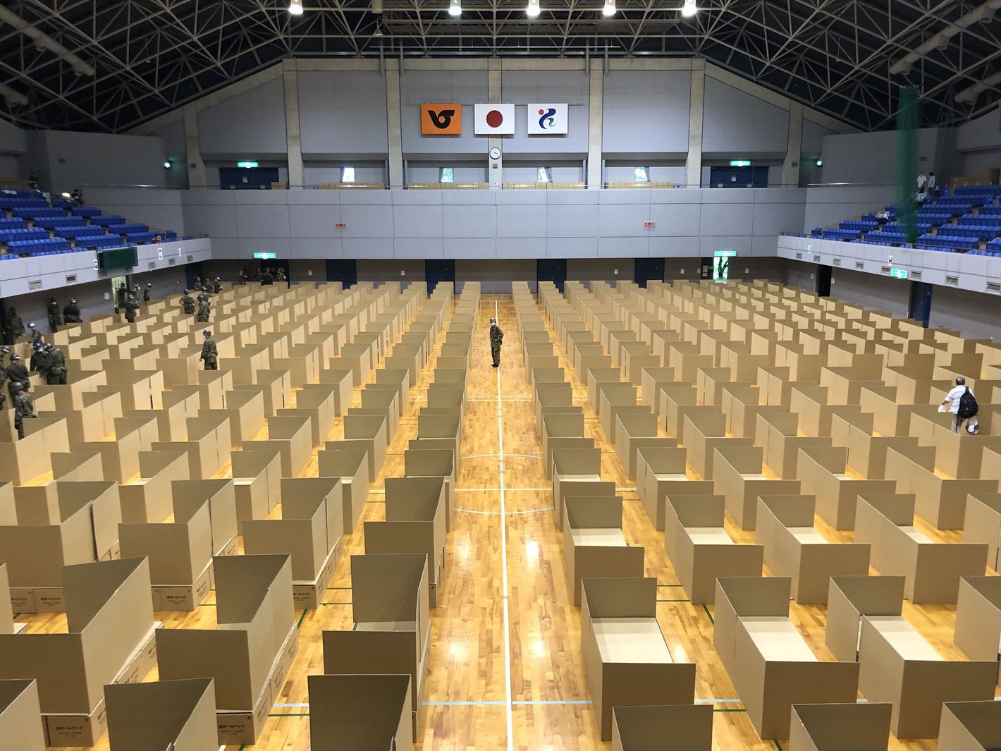 2020年7月、豪雨災害が発生した熊本県人吉市。体育館いっぱいに段ボールベッドが並んでいる。