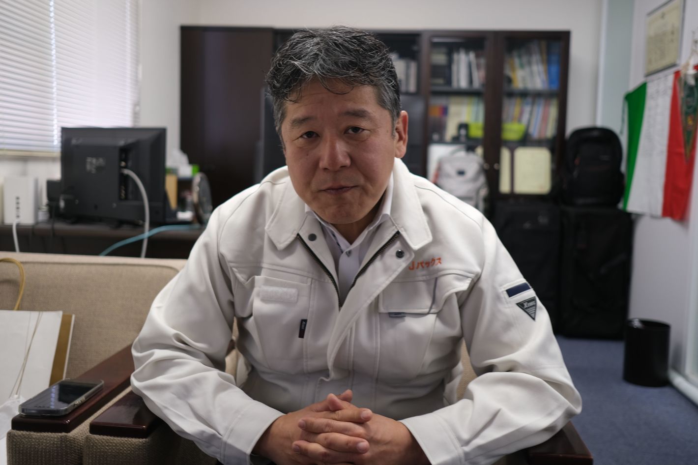 インタビューに応じる水谷嘉浩社長。2022年、避難所や段ボールベッドの研究で博士号を取得した。「世界で唯一の段ボールベッド博士」という。