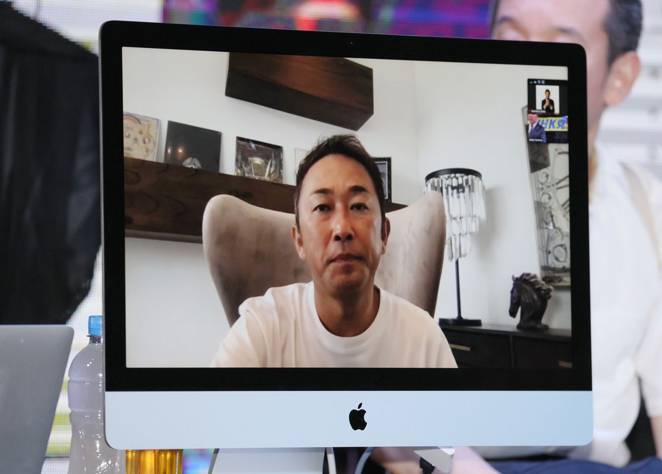 NHK党の参院選の開票記者会見で、オンラインで登場した東谷義和氏=2022年7月10日夜、東京都港区