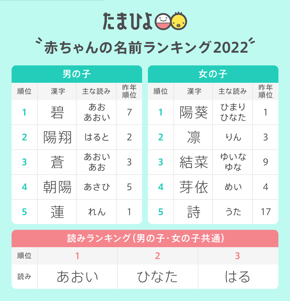 たまひよ 赤ちゃんの名前ランキング2022 男の子「碧」初の1位獲得、女の子「陽葵」7年連続1位