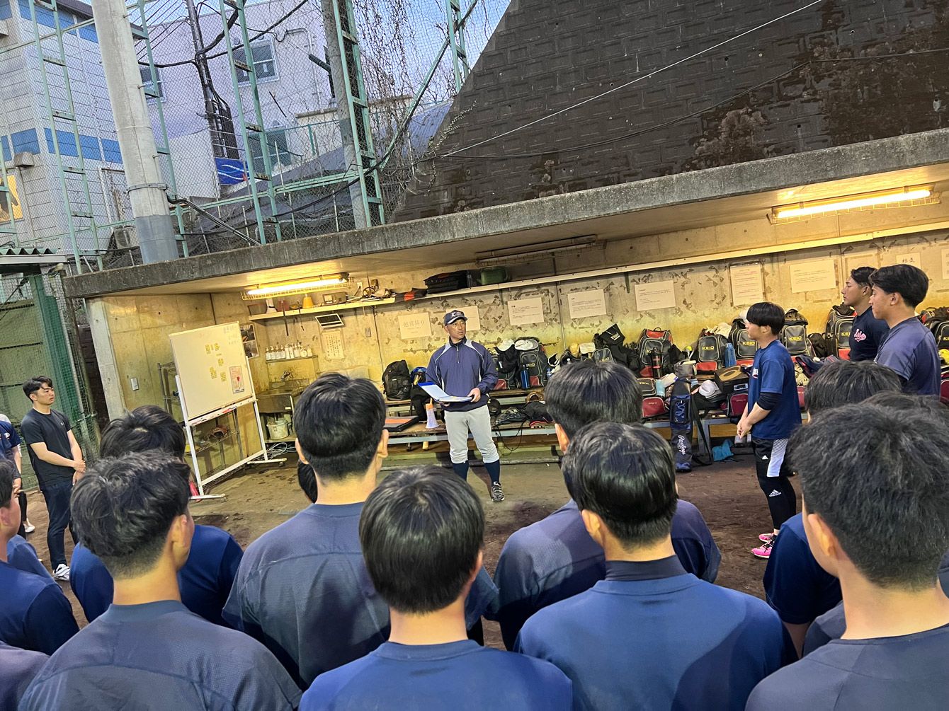 監督を囲んで、円陣。塾高グラウンドにて。