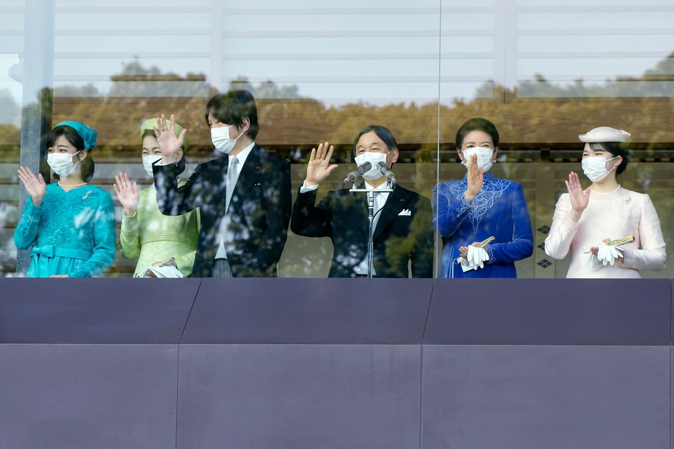 天皇陛下の63歳の誕生日を祝う一般参賀で、宮殿・長和殿のベランダに立ち、参賀者に手を振って応える天皇陛下(中央)、皇后さま(陛下の右隣)、愛子さま(右)と、左から佳子さま、紀子さま、秋篠宮さま(=2023年2月23日、皇居)