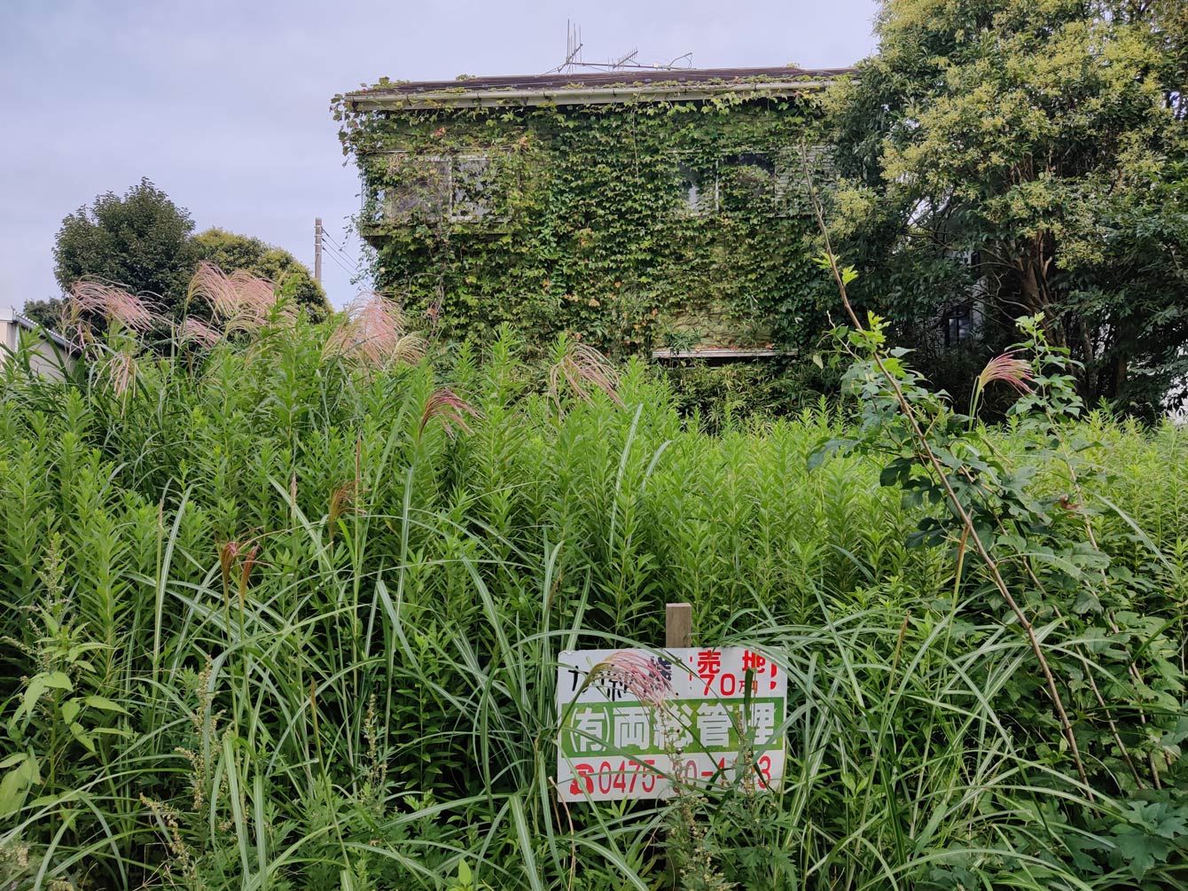 茂原市内に営業所を置く草刈り業者の看板。所有者の姓が記載され、「売地」の看板も並べて立てられている。この業者は自社サイトで物件情報を積極的に公開している会社のひとつ。(千葉県八街市八街は)