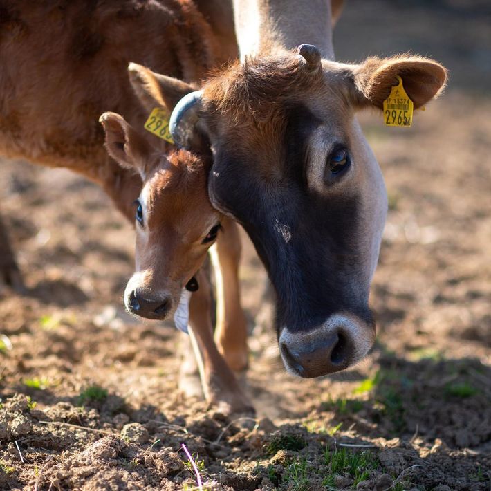 母牛に甘える仔牛。仔牛は母牛に顔をなめてほしくて、顔を近づけてくる。牛は愛情深い動物だ。