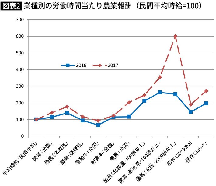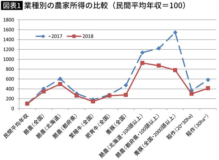 出典=農家所得:農水省「営農類型別経営統計(個別経営)」、民間の平均年収は国税庁「平成30年分民間給与実態統計調査結果について」より筆者作成