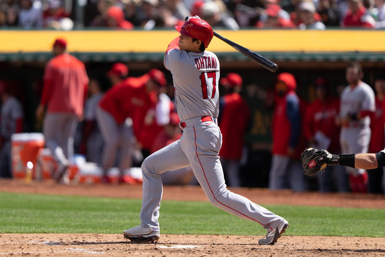 2023年4月2日、リングセントラルコロシアムで行われたオークランド・アスレチックス戦で5回にソロ本塁打を放ったロサンゼルス・エンゼルスの大谷翔平