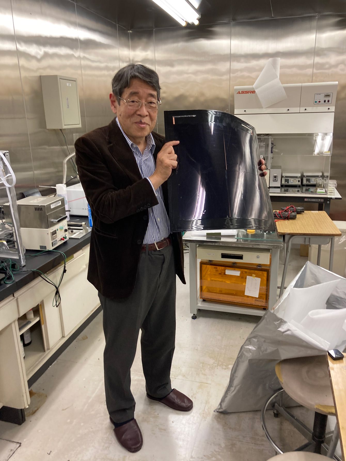 極薄、軽量のペロブスカイト太陽電池。サンプルを手にもつ宮坂力さん。