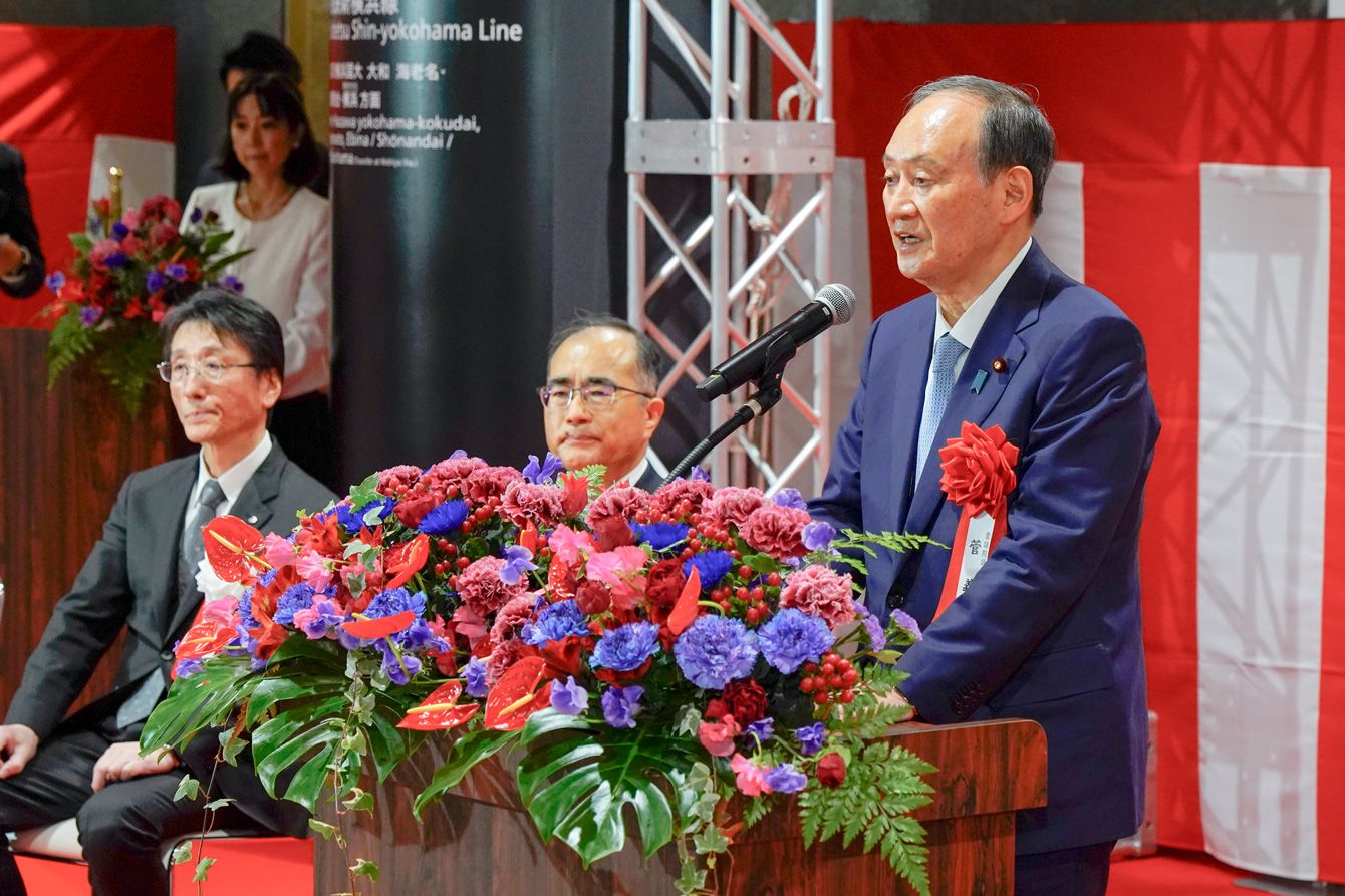 開業前に執り行われた竣功開業式典で祝辞を述べる菅義偉元総理