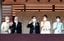2023年1月2日、新年一般参賀で、長和殿ベランダに立ち、参賀者に手を振って応える(左から)上皇后美智子さま、上皇さま、天皇陛下、皇后さま、愛子さま