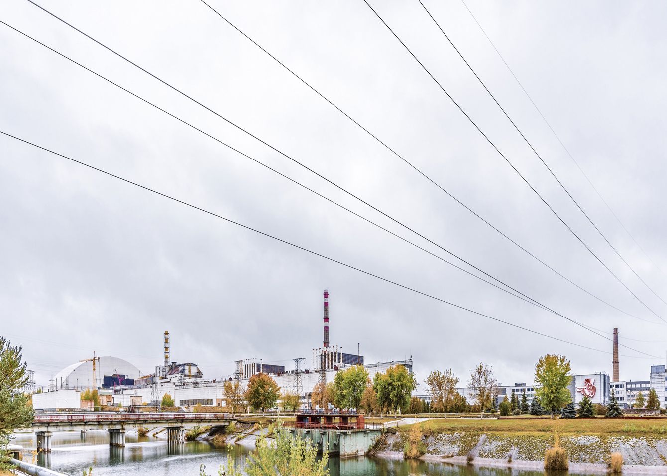 チョルノービリ原発の全景。左にみえるのが建設途中の「新石棺」(2016年撮影)