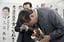 神奈川県知事選で当選確実となり、支援者らに頭を下げる黒岩祐治氏=2023年4月9日、横浜市内