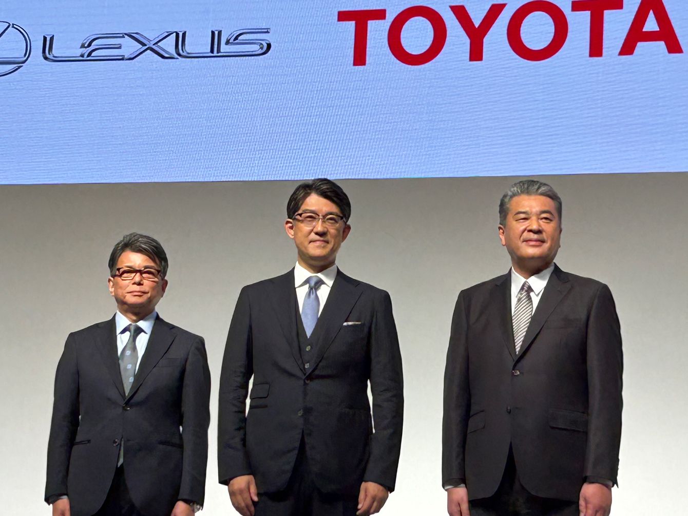 (左から)トヨタ自動車の宮崎洋一副社長、佐藤恒治社長、中嶋裕樹副社長。同社は4月7日に会見を開き、今後の経営方針を説明した