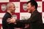 2018年5月24日、東京都内で行われた記者会見で握手するスペインサッカー界のスター選手アンドレス・イニエスタ(左)と楽天とヴィッセル神戸のクラブオーナーである三木谷浩史氏。