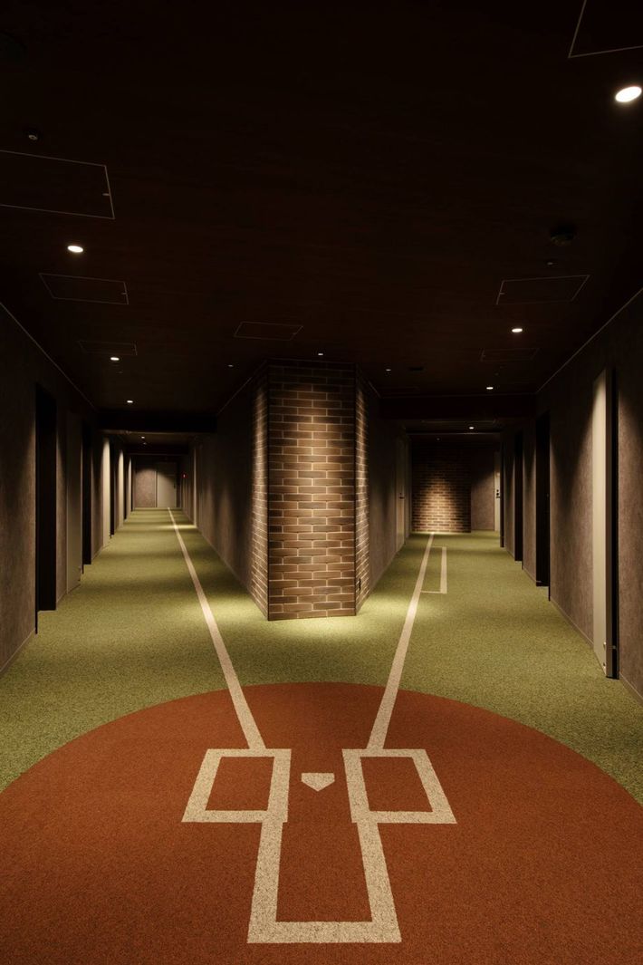 球場内ホテル「tower 11 hotel」の客室廊下。子どもが喜びそうな演出があちこちに施されている