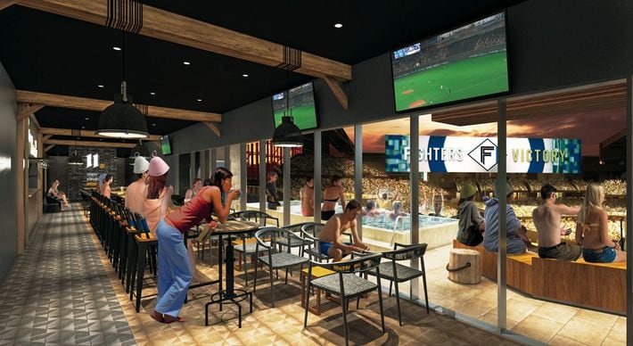 温浴施設の「tower 11 onsen&sauna」。温泉プールにつかり、水着姿で観戦できる