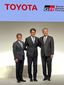 新体制方針説明会に登壇した(左から)宮崎洋一副社長、佐藤恒治新社長、中嶋裕樹副社長