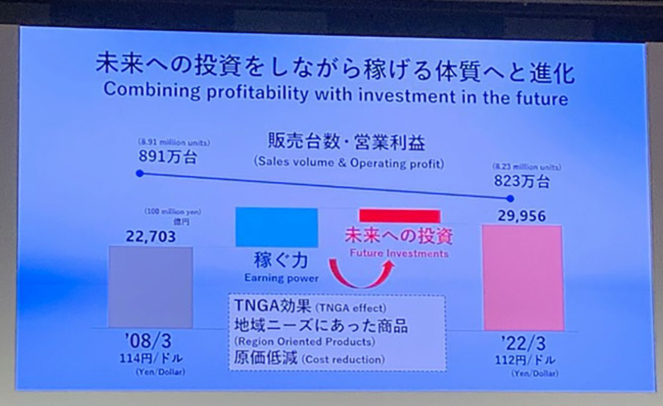 新体制方針説明会に登壇した(左から)宮崎洋一副社長、佐藤恒治新社長、中嶋裕樹副社長