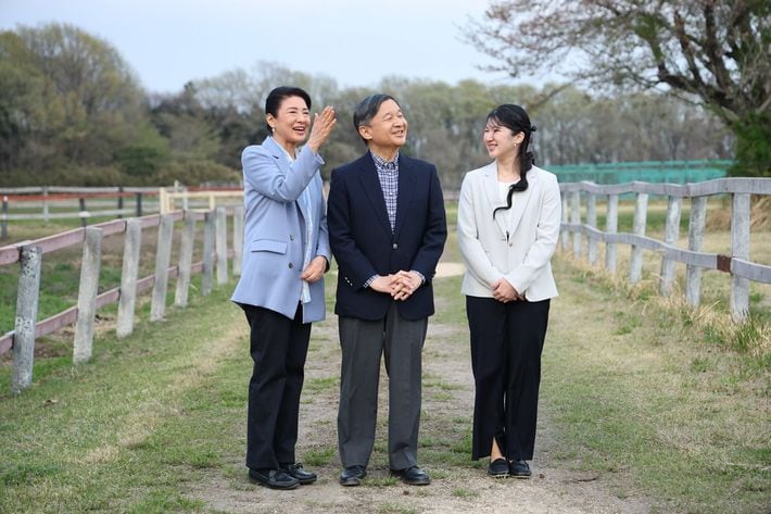 御料牧場内を散策される天皇、皇后両陛下と長女愛子さま=2023年4月5日午後、栃木県高根沢町