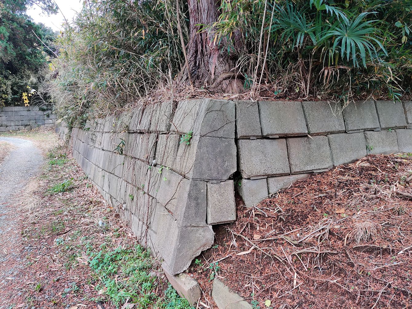 不適切な植樹のために、生育した木の根によって崩壊が進む擁壁。(千葉県多古町十余三)
