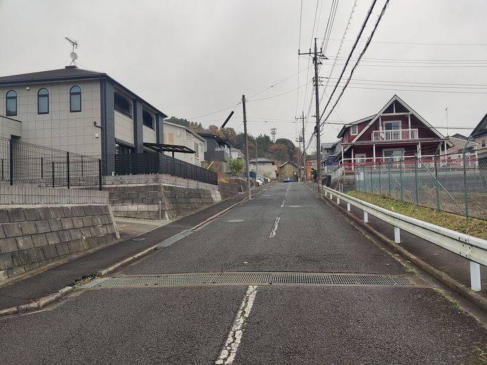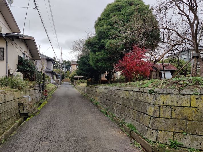 開発時期の古い住宅地においては、緩やかな地形においても、あえて擁壁が造られているところも見かける。(千葉県多古町飯笹)