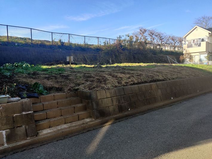 周囲に住宅が建ち並んでいても、高い擁壁がある区画だけが放置されている光景を見ることも珍しくない。(千葉県山武市雨坪)