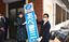 安倍事務所の閉鎖に合わせ、看板を下ろす安倍昭恵さん(左から3人目)=2022年12月28日午後、山口県下関市